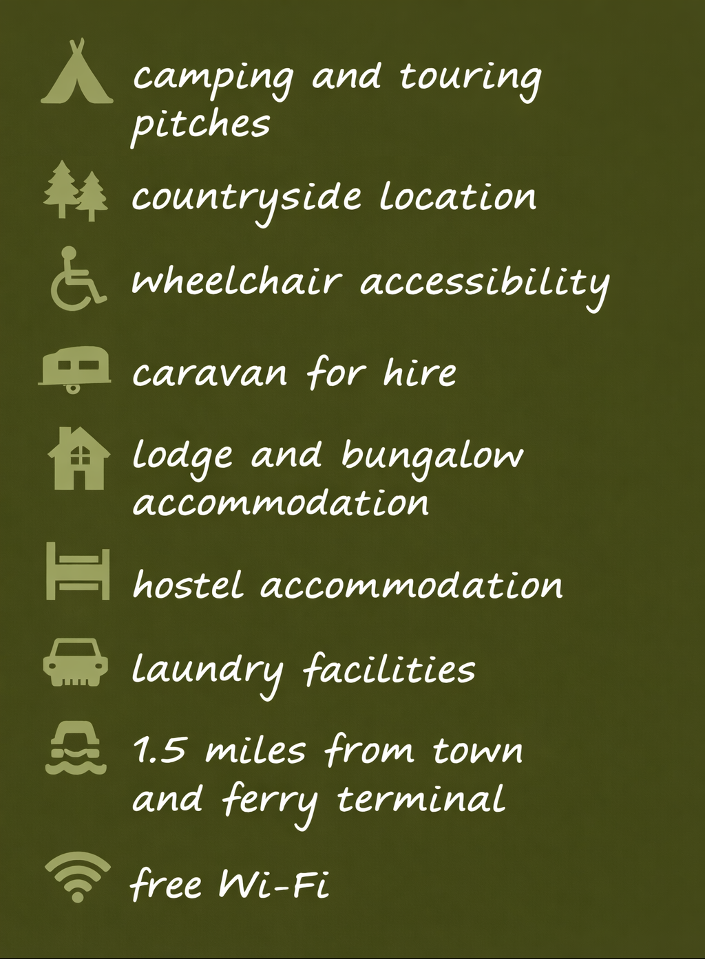Wireless Internet (WiFi) is available throughout the park. A heated modern amenities block provides dish washing sinks, laundry facilities, toilets, free showers, wash hand basins and facilities for wheelchair users. There are also water standpipes, chemical toilet disposal and waste water disposal points.