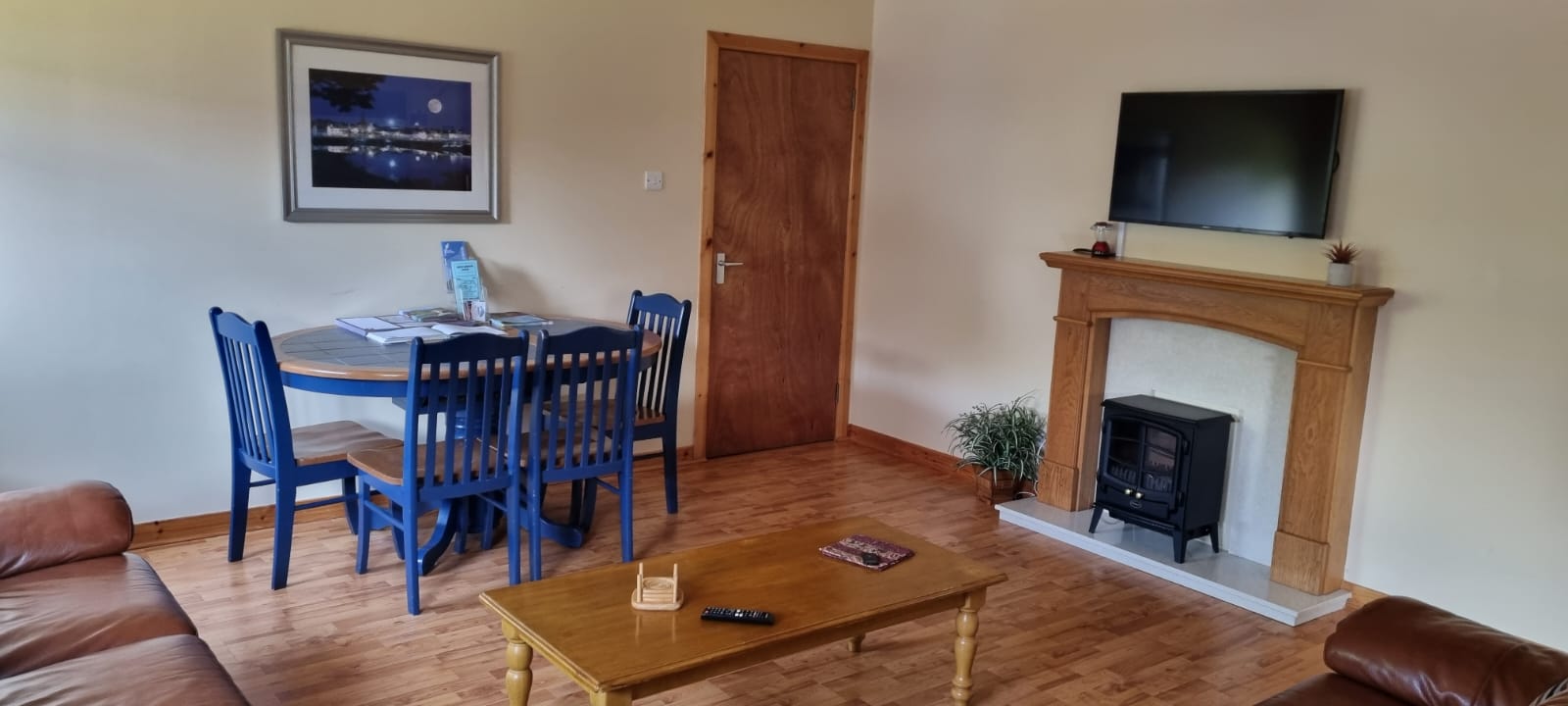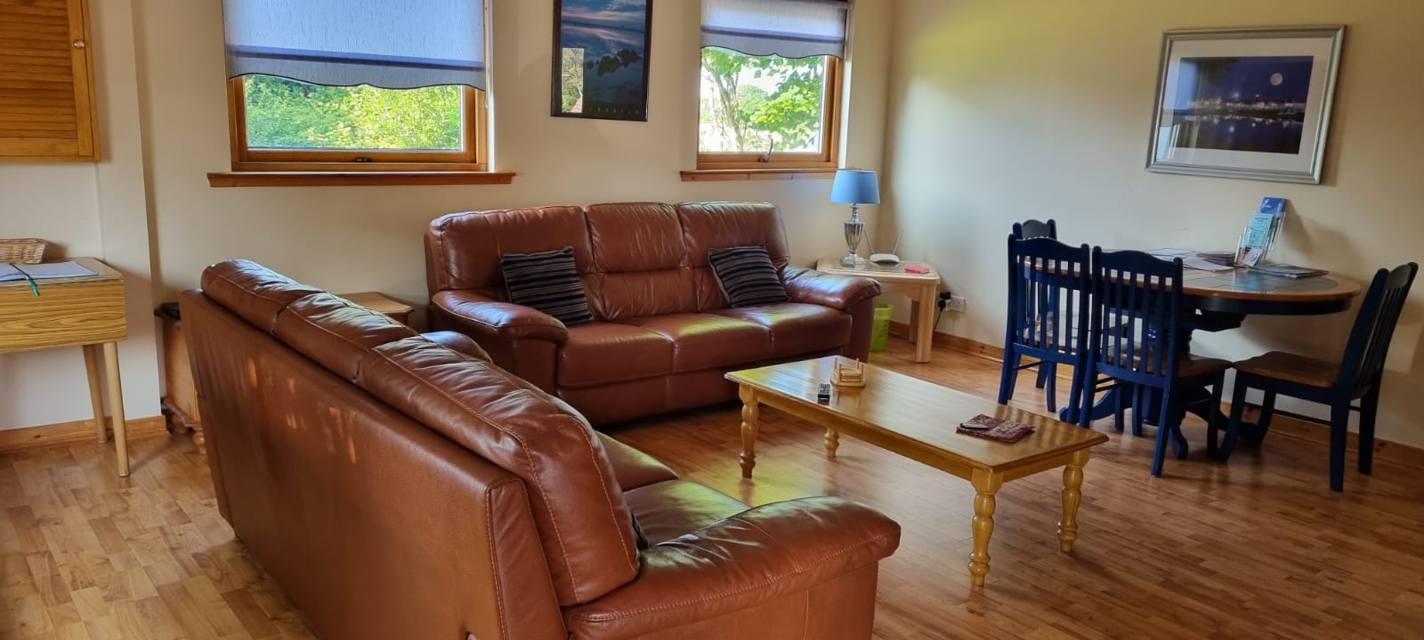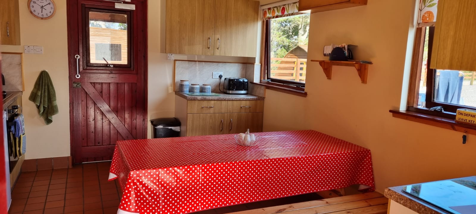 A fully equipped kitchen provides electric cookers and hobs, fridges, a microwave and a dining area suitable for eight persons.